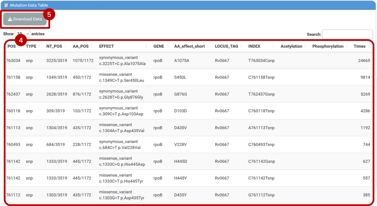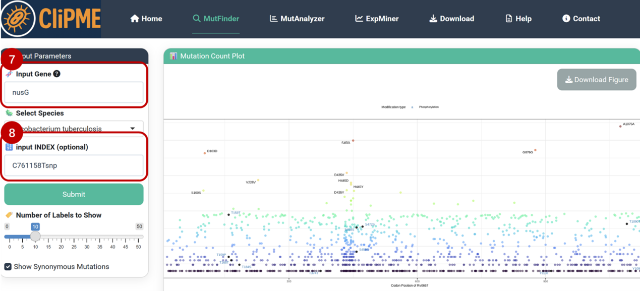 ⑦⑧Enter nusG in [Input Gene] and paste INDEX(C761158Tsnp) into the [Input INDEX] field, Click [Submit] and navigate to the [Mutation Data Table] to view filtered results: