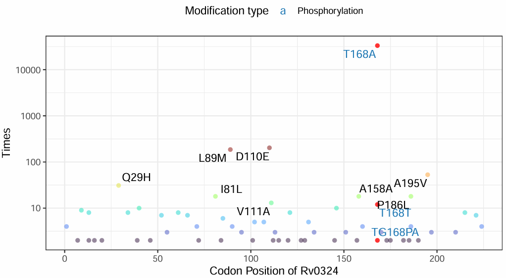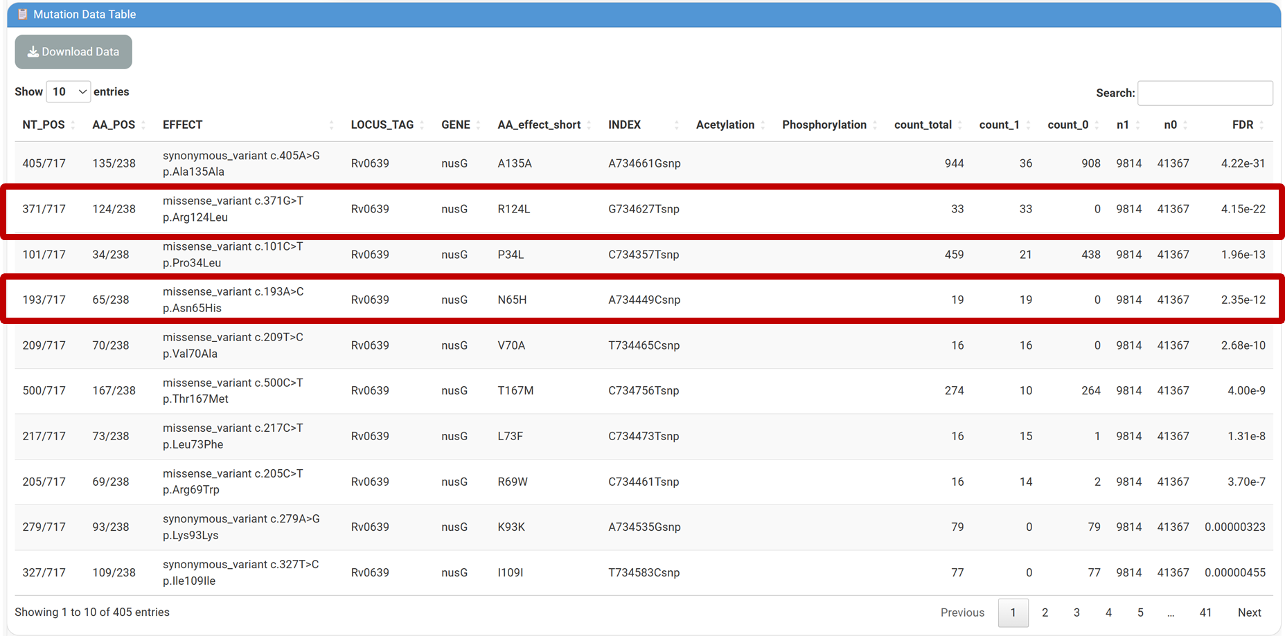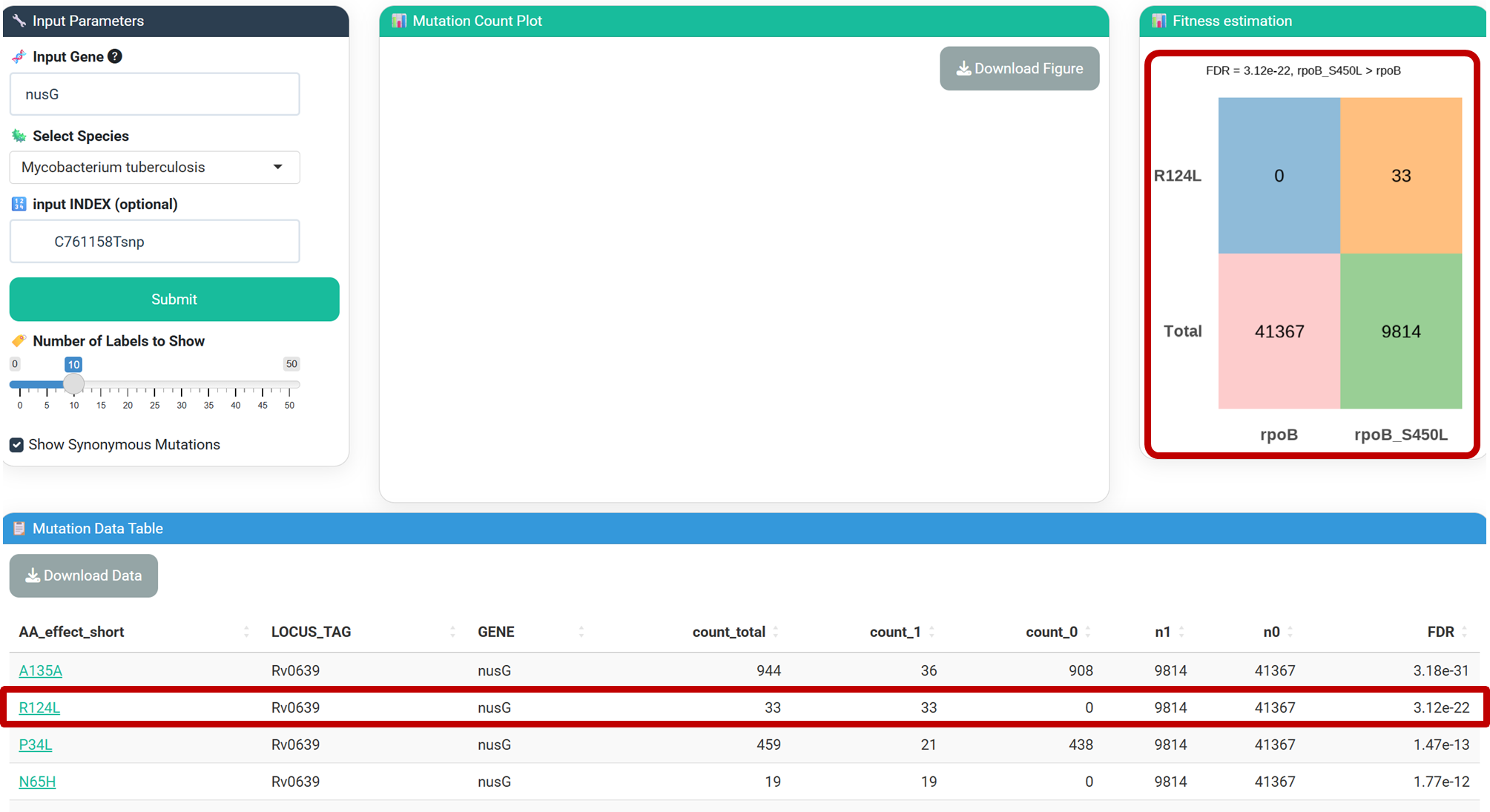 Result: The R124L and N65H mutations in nusG are significantly overrepresented in rpoB S450L strains (FDR = 4.15E-22), and has already been proved with improved fitness in RIF-resistant Mtb in a previous study published in Nature (2024) . Click the link in [AA_effect_short] column in the table to visualize the result for each mutation.