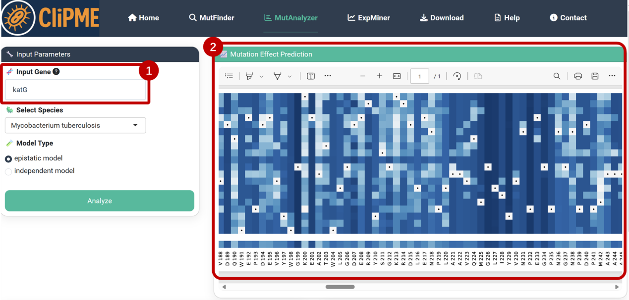 Enter the gene name (katG) or gene locus in the [Input Gene] field, and select species and analysis model (refer to EVcouplings literature for model differences), click [Analyze] to initiate computation.