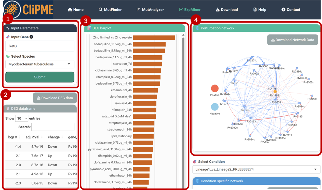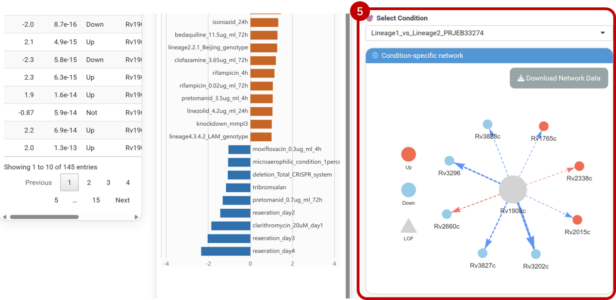 Selecting experimental conditions via dropdown menus to analyzes context-specific interactions between differential genes and katG. Integrates mutation and transcriptomic data to annotate unfixed loss-of-function mutations (▲) within the network, revealing their context-dependent functional roles. Click [Download Network Data] to export interaction pairs and mutation annotations.