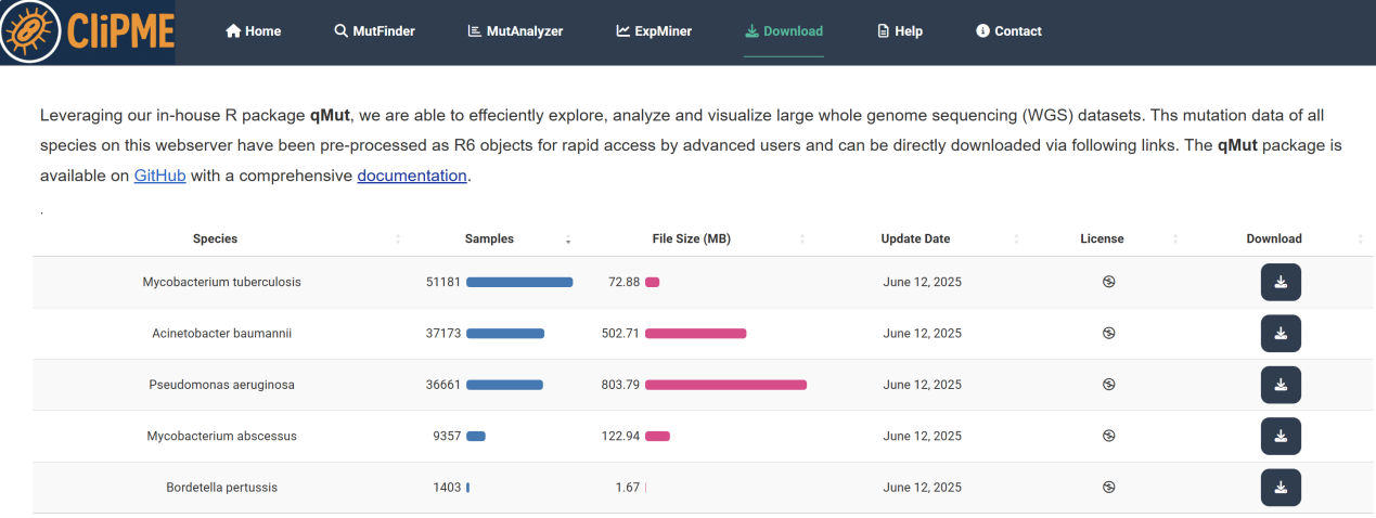 CliPME is the first database dedicated to store/analyze mutation profiles and regulatory networks from sequencing data of multiple pathogenic bacteria. Hosted on a high-performance Linux cloud server, it integrates genomic and transcriptomic data from pathogenic bacterial species, encompassing large sequencing samples across different published datasets. The database is organized into three core modules (MutFinder, MutAnalyzer, and ExpMiner), providing a powerful platform for mutation analysis, functional prediction, and gene regulatory network exploration. We also developed R package qMut to provide advanced R users with a high-efficiency data analysis interface. In the future, we will continue to expand the database's species coverage to establish a more comprehensive platform for clinical pathogenic bacteria analysis.