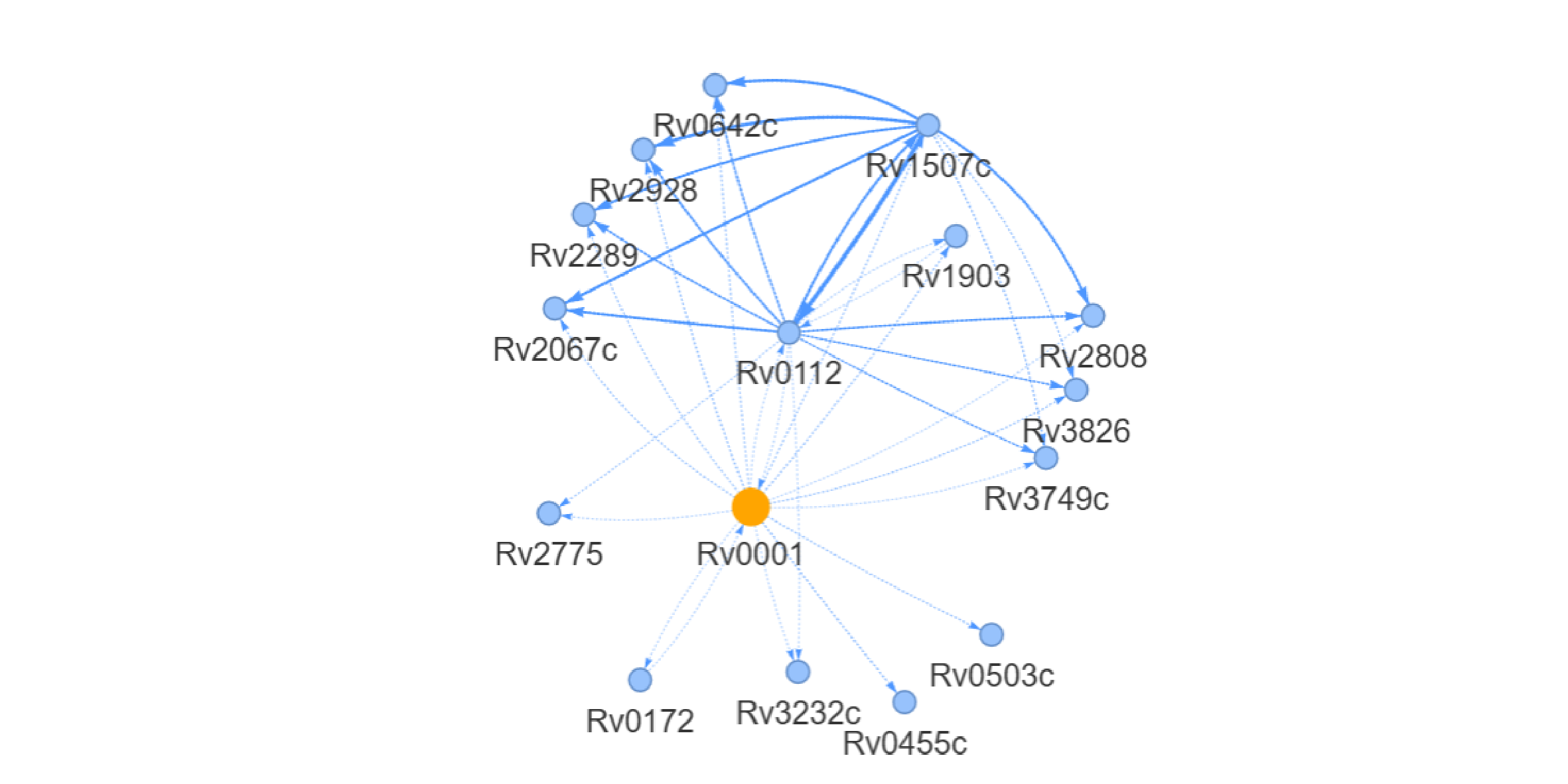 Constructs a species-wide directed gene regulatory network using Bayesian network-based causal structure learning. Displays downstream genes affected by katG expression perturbations. Click [Download Network Data] to export edge lists and interaction scores.